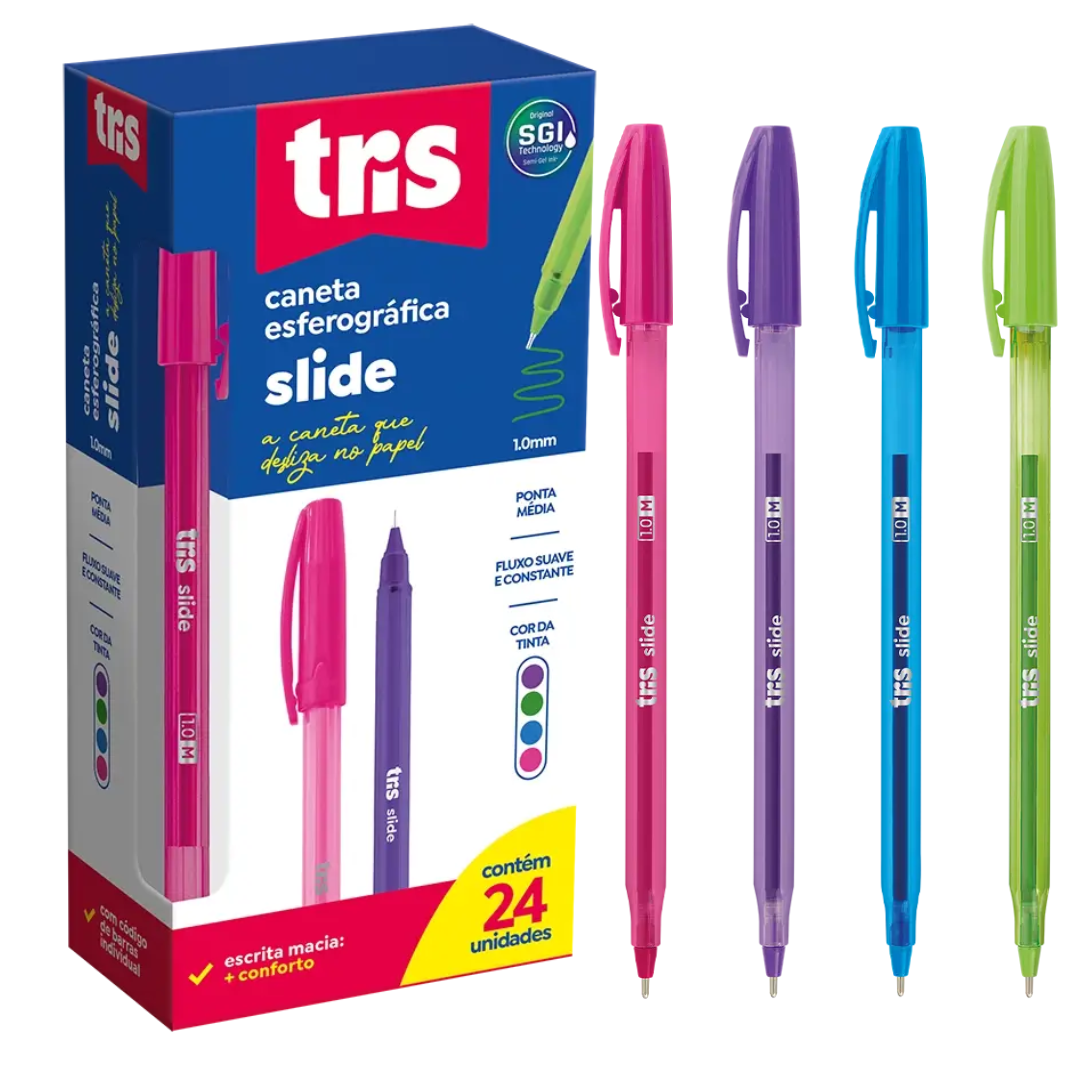 A caneta Slide Fashion possui 4 cores incríveis pra você escolher. Ela possui ponta média 1.0mm, tampa ventilada, secagem rápida que não borra e uma escrita super macia! Cores sortidas: verde, laranja, azul, rosa e roxo