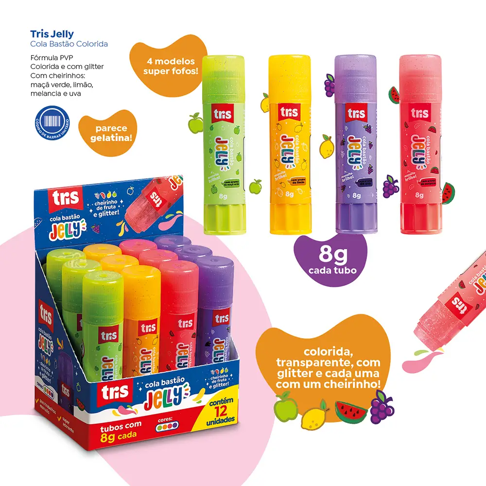 Diversão e brilho na hora de colar! A Cola Bastão Jelly Tris tem cheiri nho de fruta, glitter e cores incríveis. Com 8g e super aderente, é perf eita para deixar seus projetos ainda mais criativos!