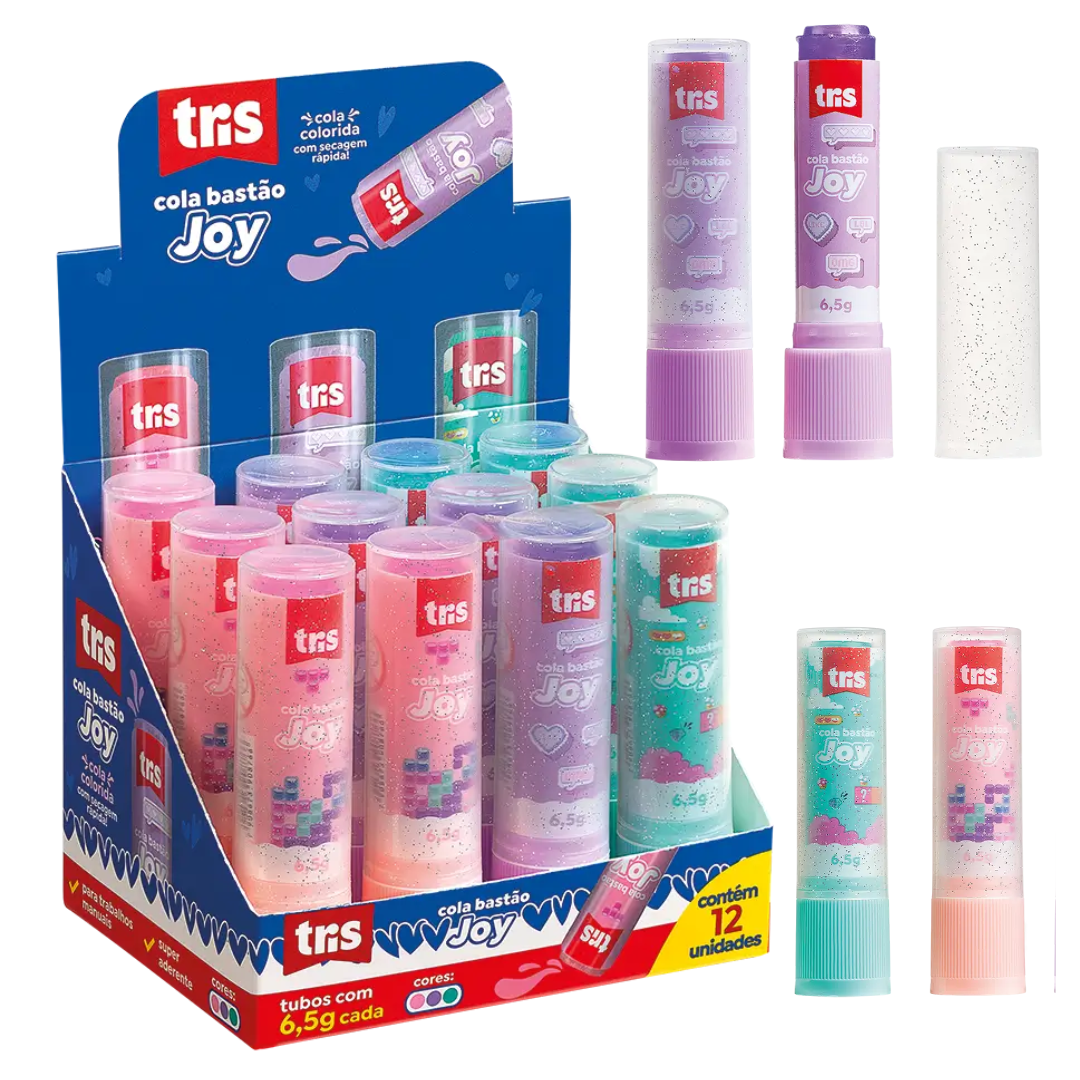 Praticidade e estilo para o dia a dia! A Cola Bastão Joy Tris de 6,5g é colorida, dando mais personalidade para suas colegens. Fácil de aplicar, seca rápido e vem em um display com 12 unidades. Perfeita para escola, escritório e projetos criativos!