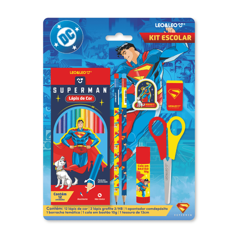 Além de trazer alegria e força no dia a dia, o Superman deixa o estudo muito mais atrativo e divertido com o Kit Lápis de Cor 12 Cores Superman – Caixa com 6 Kits Leo&Leo.