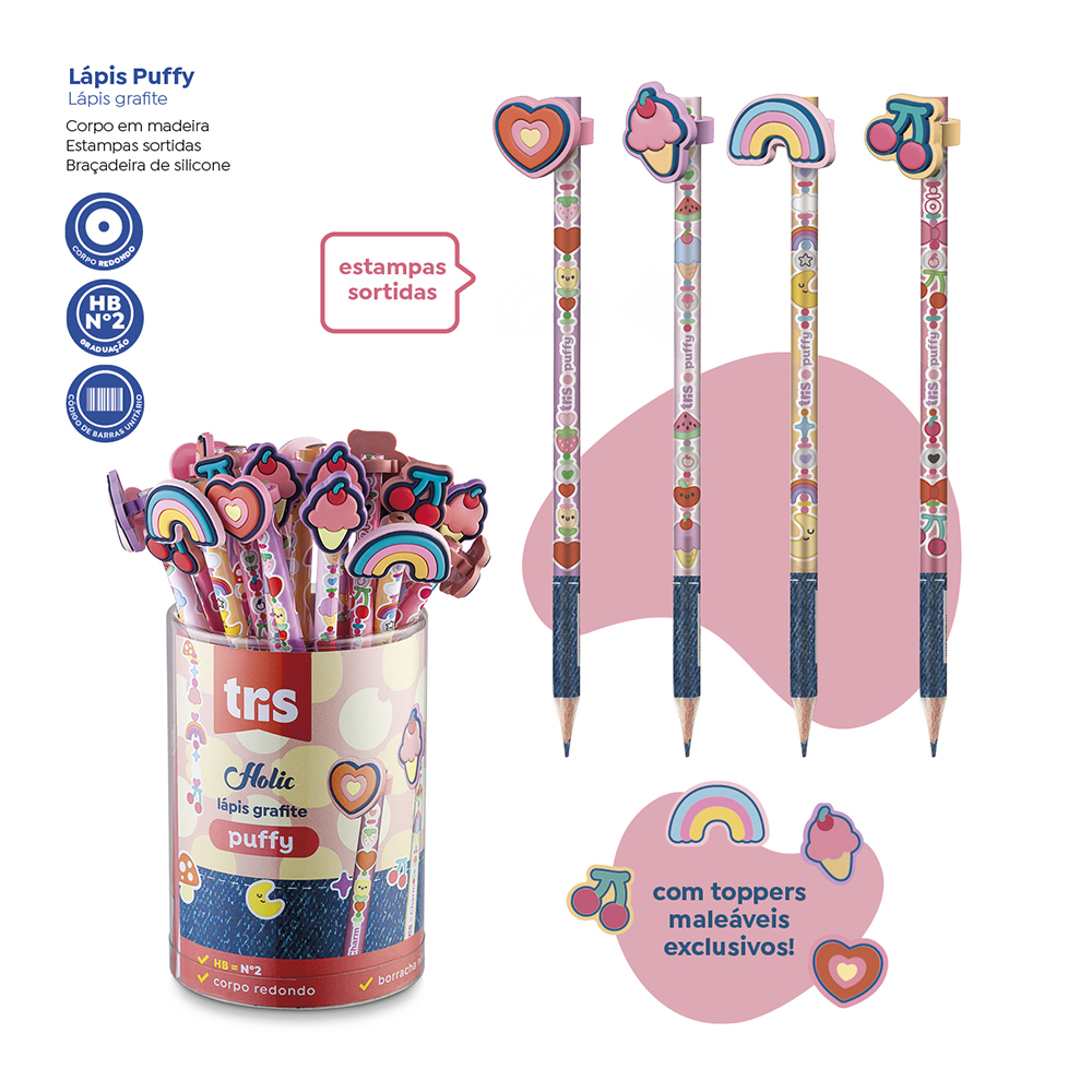 Inspirada nos pingentes e miçangas que estão em alta, a coleção Charm co nta com cores alegres e design divertido. É perfeita para customizar e c riar memórias especiais com os amigos! O lápis grafite Puffy tem topper de silicone exclusivos, corpo redondo e 4 estampas temáticas.